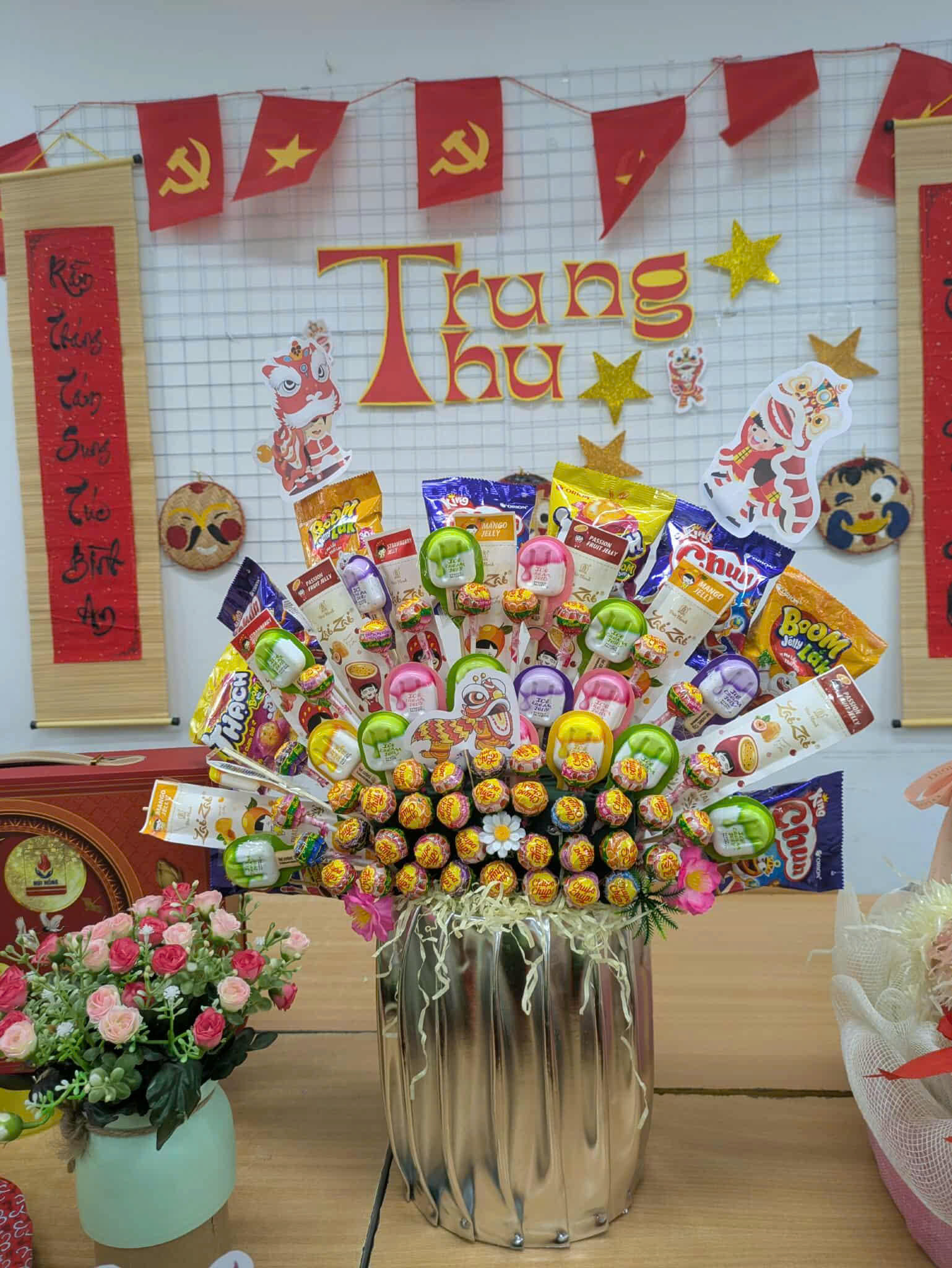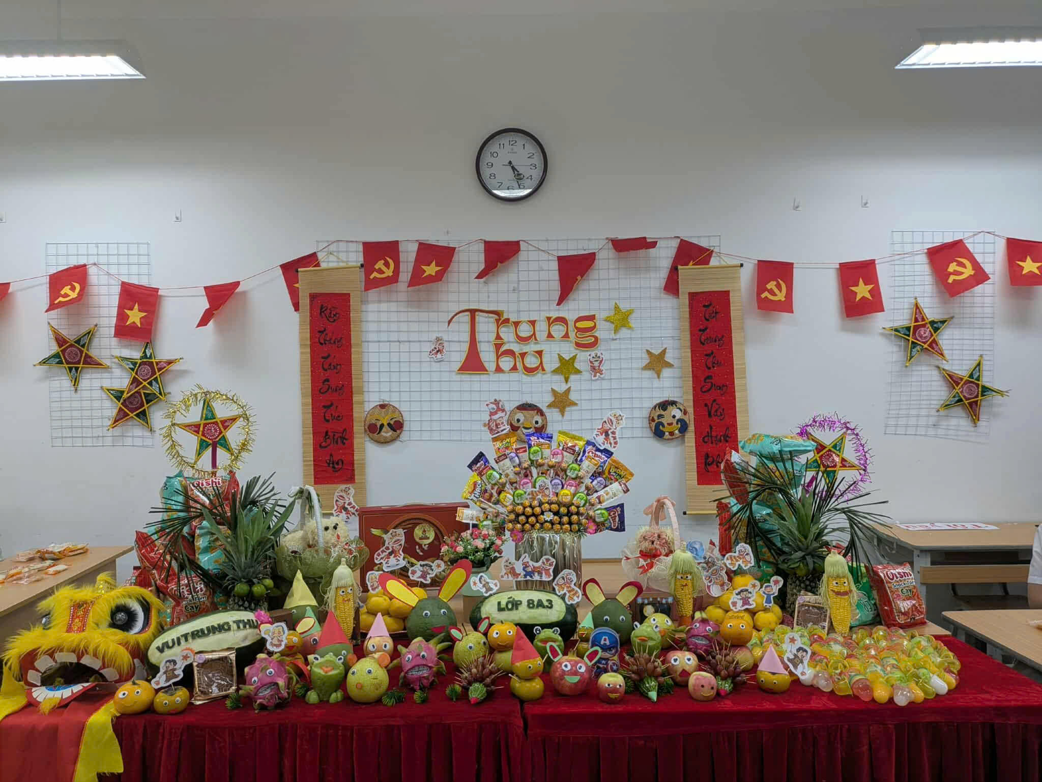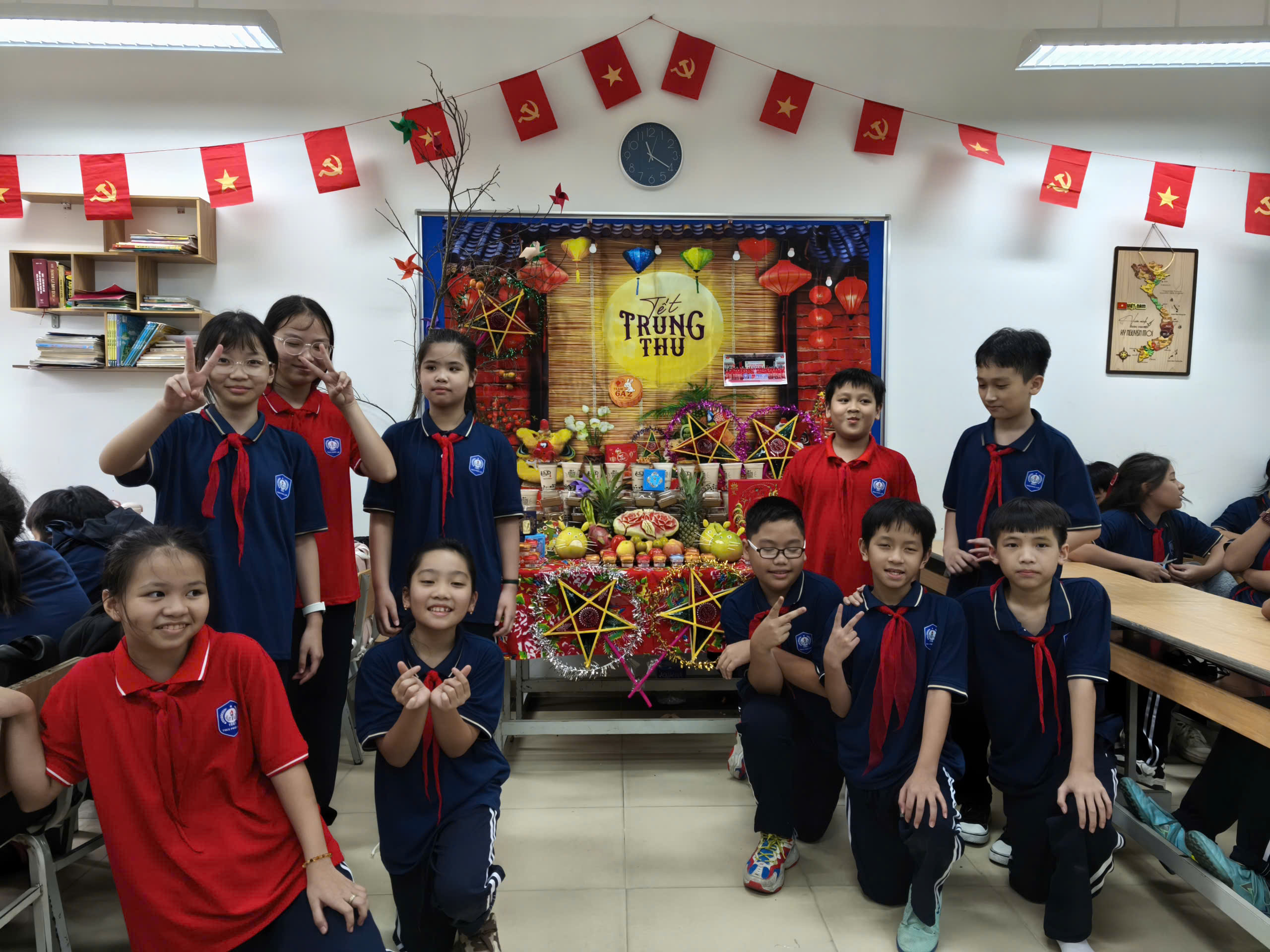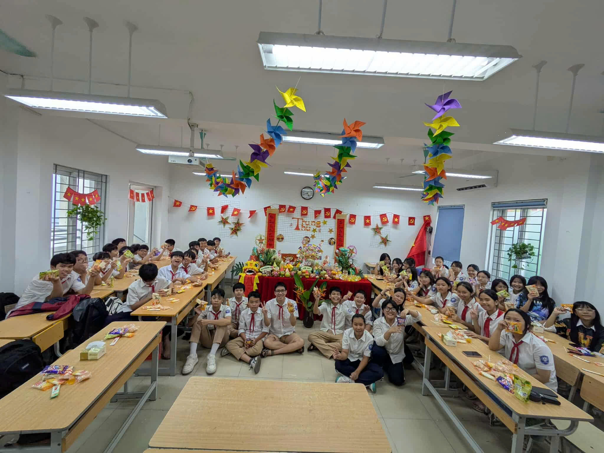 💕Các lớp học được trang trí rực rỡ với chong chóng sắc màu, đèn lồng, mâm cỗ Trung thu, bánh nướng – bánh dẻo và những tấm thiệp gửi lời chúc yêu thương. Mỗi góc lớp là một không gian sáng tạo, nơi các em học sinh thể hiện sự khéo léo, tinh thần đoàn kết và niềm vui tuổi học trò.