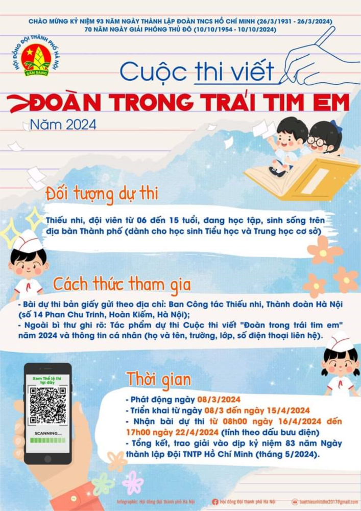Chào mừng kỷ niệm 93 năm Ngày thành lập Đoàn TNCS Hồ Chí Minh (26/3/1931 - 26/3/2024), nhằm thể hiện tình cảm của thiếu nhi, đội viên Thủ đô tới tổ chức Đoàn TNCS Hồ Chí Minh và các thế hệ cán bộ Đoàn,Hội đồng Đội Thành phố Hà Nội phát động Cuộc thi viết “Đoàn trong trái tim em” năm 2024.